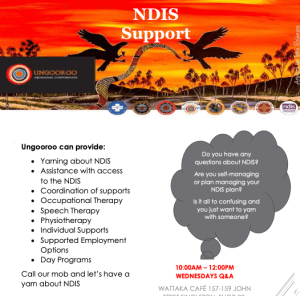 Ungooroo is an approved National Disability Insurance Scheme (NDIS) provider. As an NDIS provider we can help access the NDIS and provide:- Yarning about the NDIS (Wattaka Cafe every Wednesday 10am to 12noon)